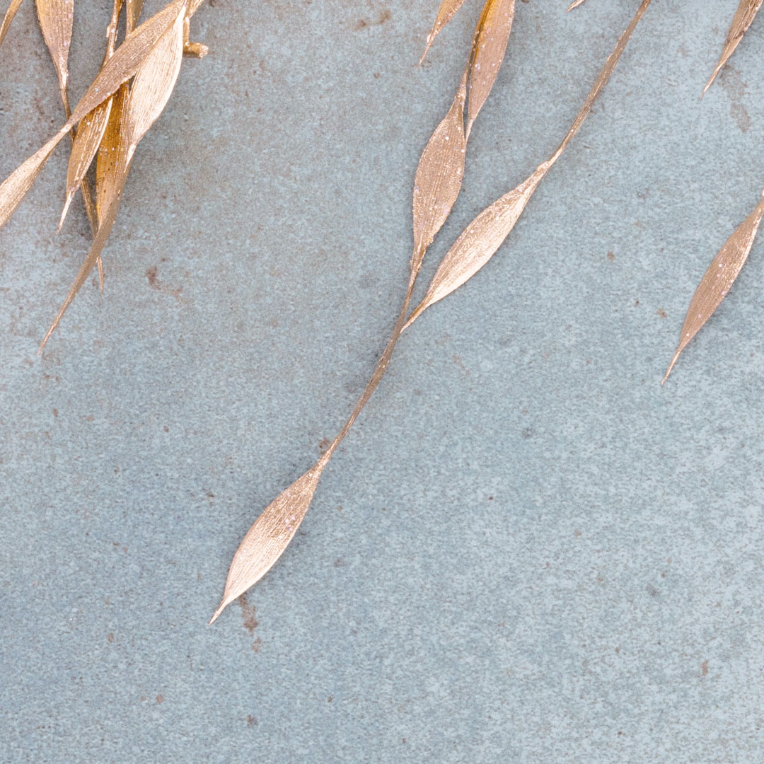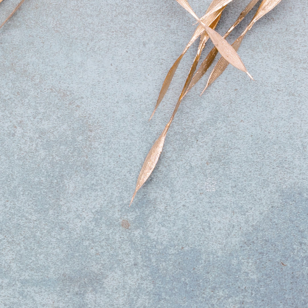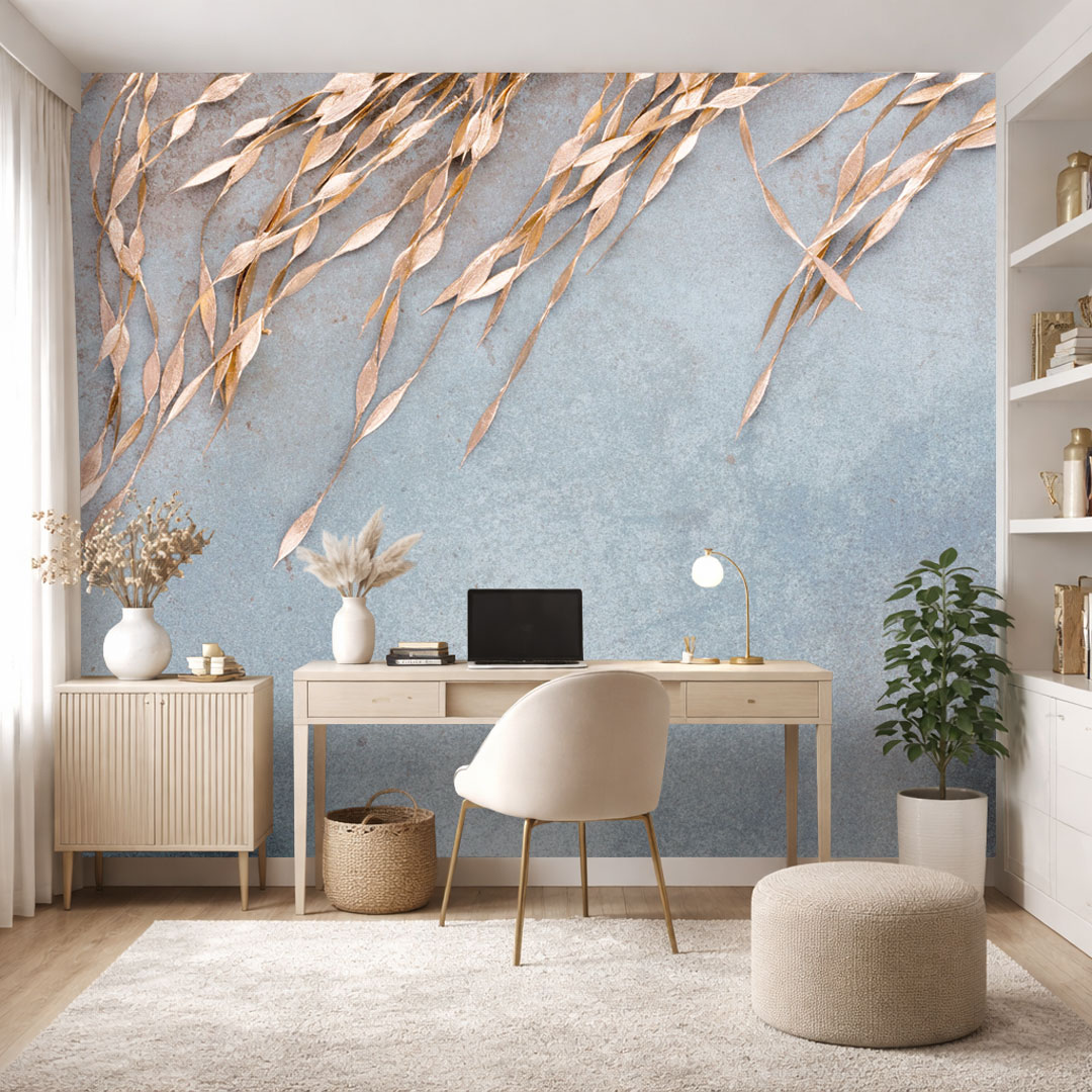 Chłodny, przygaszony odcień niebieskiego tła z rdzawo-brązowymi plamkami tworzy spokojną, sprzyjającą koncentracji atmosferę, a złote, roślinne motywy dodają wnętrzu wyrafinowania i oryginalnego charakteru. Kolor złotych roślin nie błyszczy się i wpadają lekko w odcień różówego złota. Tapeta przyciąga wzrok, nie dominując przestrzeni - idealna do nowoczesnych i minimalistycznych aranżacji.