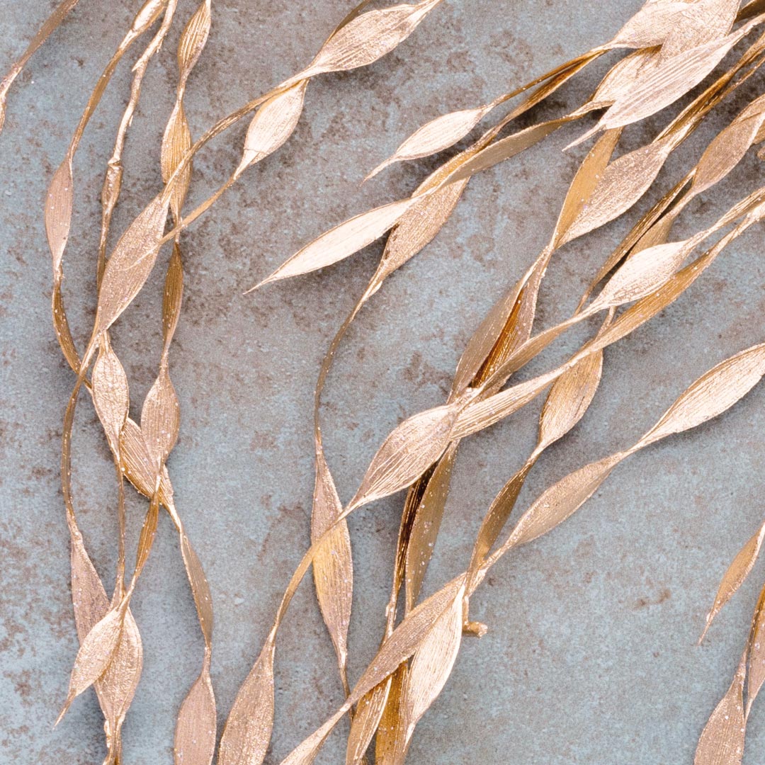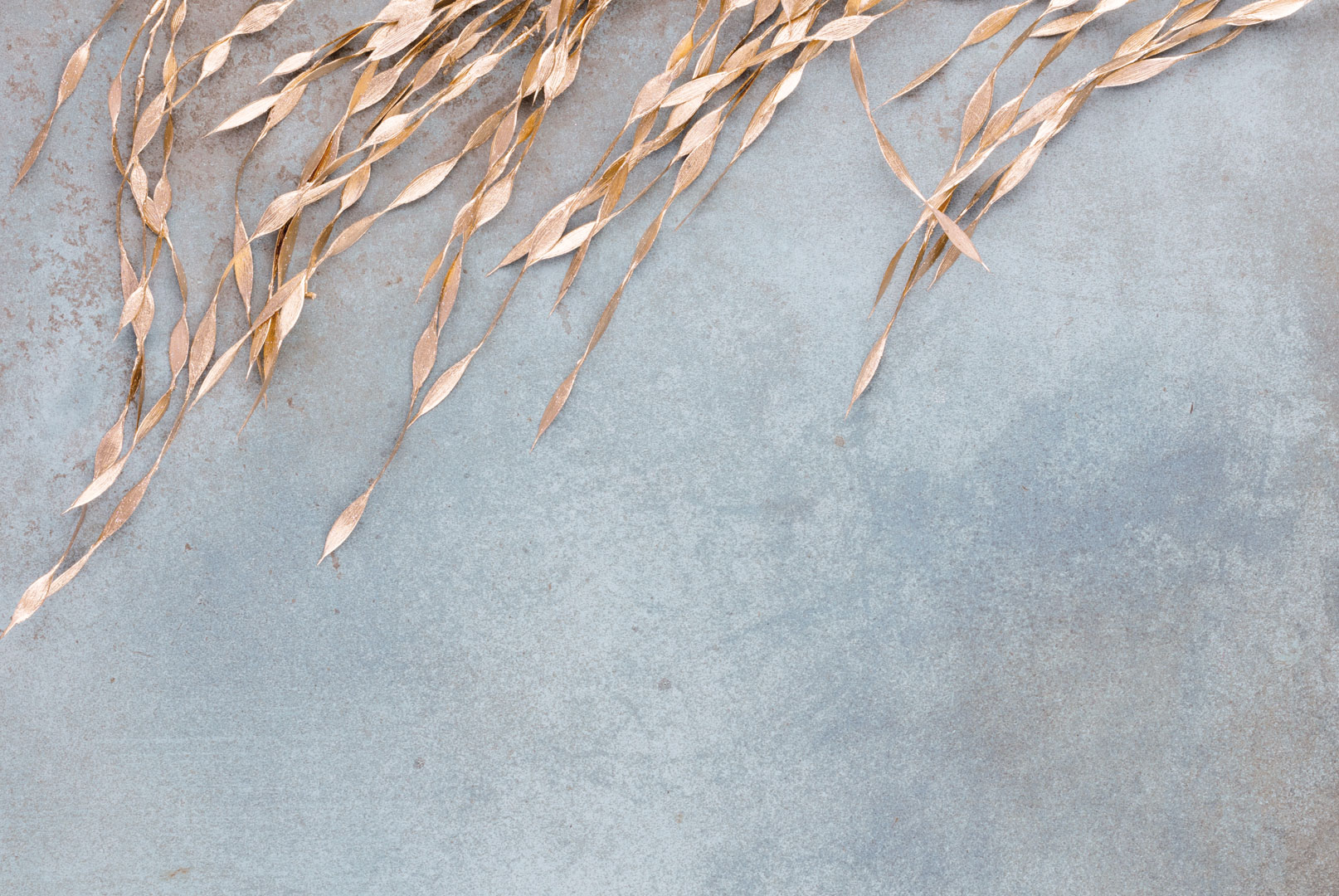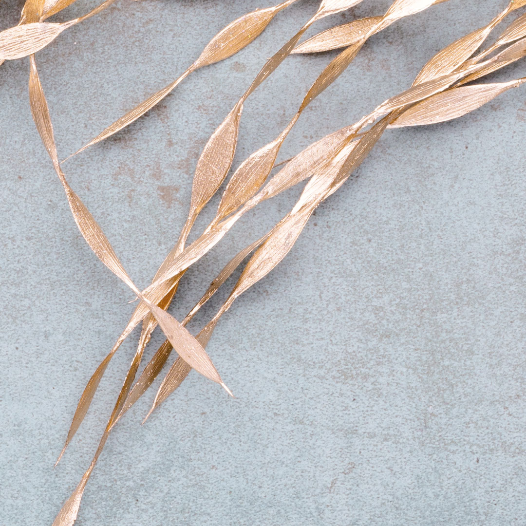 Chłodny, przygaszony odcień niebieskiego tła z rdzawo-brązowymi plamkami tworzy spokojną, sprzyjającą koncentracji atmosferę, a złote, roślinne motywy dodają wnętrzu wyrafinowania i oryginalnego charakteru. Kolor złotych roślin nie błyszczy się i wpadają lekko w odcień różówego złota. Tapeta przyciąga wzrok, nie dominując przestrzeni - idealna do nowoczesnych i minimalistycznych aranżacji.