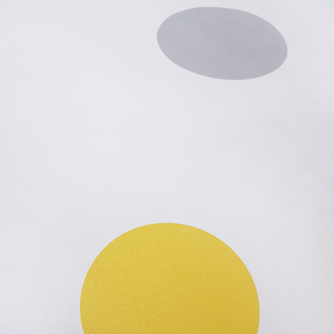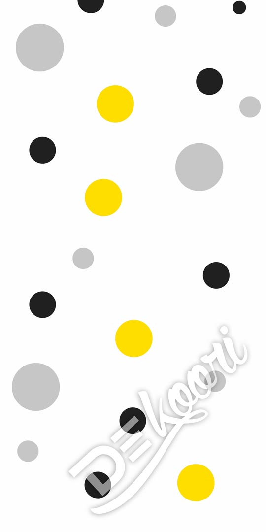 Nowoczesna tapeta w szare, czarne i żółte bąbelki, bańki mydlane unoszące się na wietrze. Idealna dekoracja, dodatek na ściany do niemalże każdego pomieszczenia: do salonu, sypialni, pokoju dziecięcego. Wzór jest tak zaprojektowany, że sąsiednie pasy tapety łączą się ze sobą tylko tłem. Na łączeniach nie ma kropek.