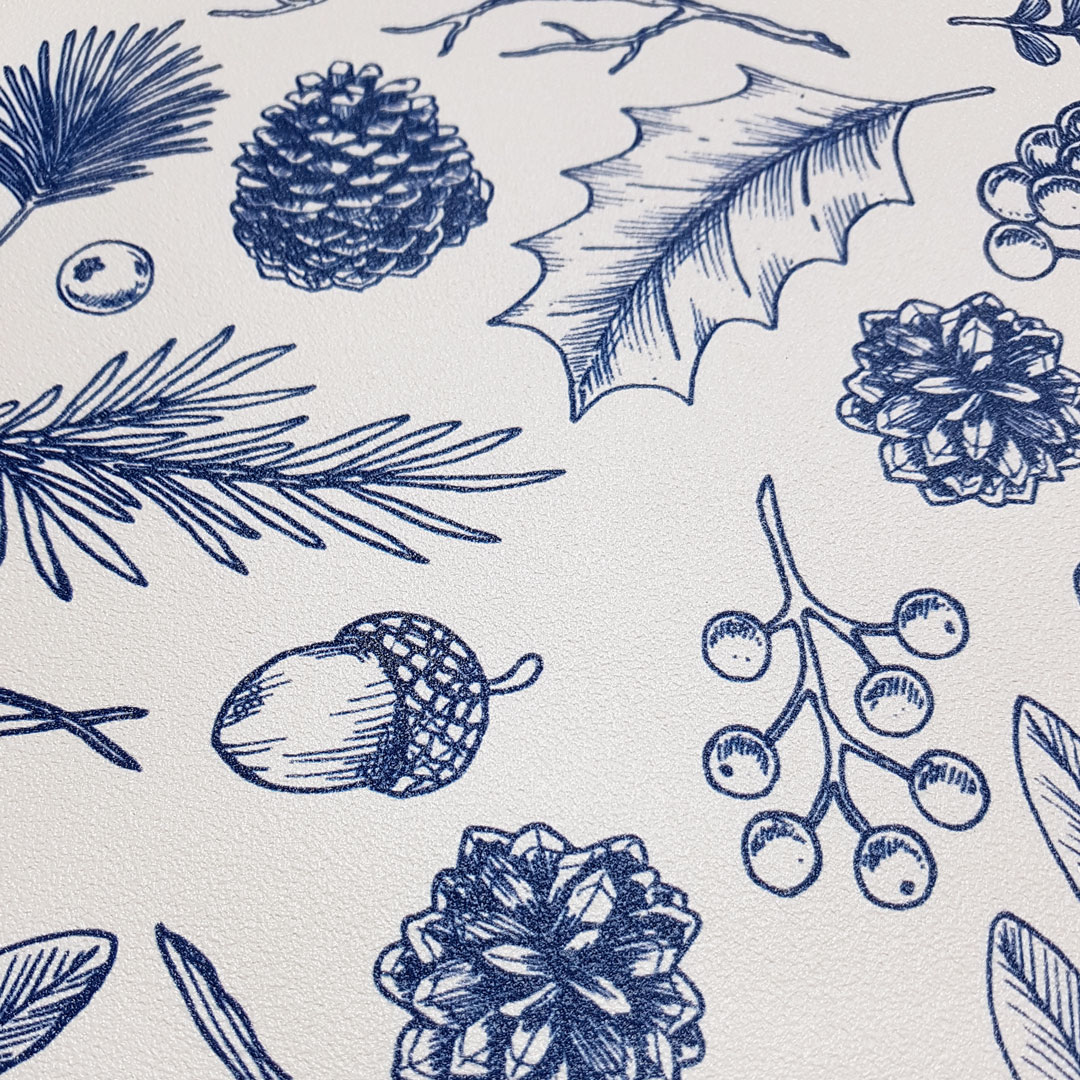 Nowoczesna biało-granatowa tapeta z motywem leśnych liści i szyszek