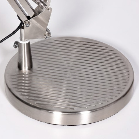Stołowa, nowoczesna lampka na biurko: srebrna RIGORRIA. Modny design, metalowy klosz, regulowane ramię i podstawa wykończone w srebrnym kolorze. Ładna, praktyczna lampa stojąca sprawdzi się w biurze lub domu jako lampka biurkowa, gabinetowa do pracy i do czytania.