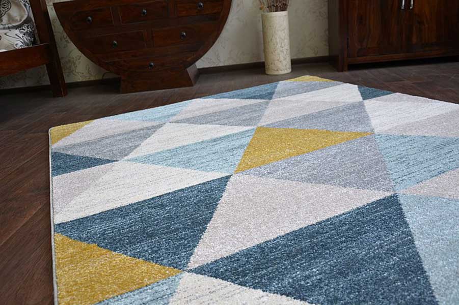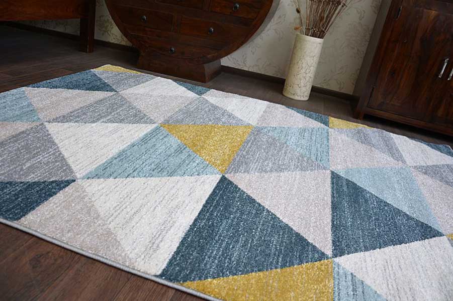 Nowoczesny dywan w pastelowe kolorowe trójkąty do salonu