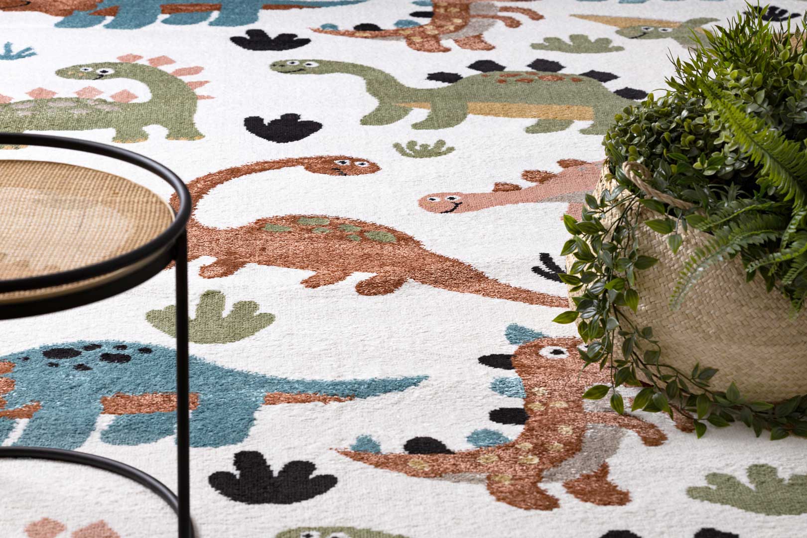 Miękki kremowy dywan dinozaury kolorowe, dziecięcy, dla dziewczynki, dla chłopca