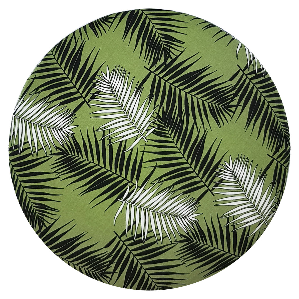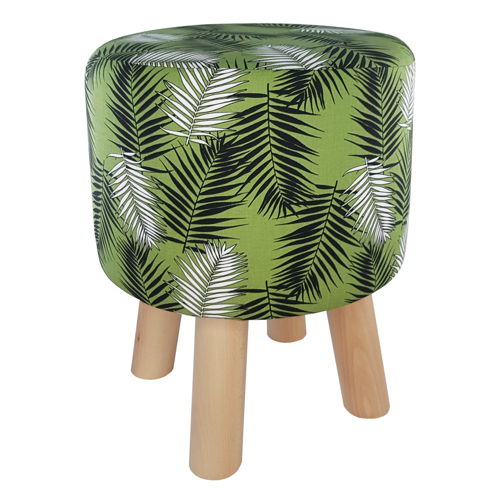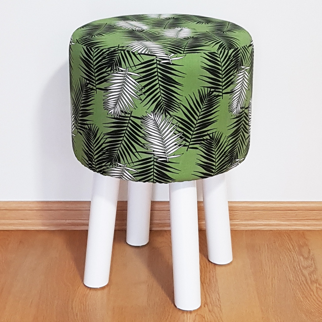 Designerski taboret o wzorze jungle, prezentującym piękne liście palmy w kolorze czerni i bieli na tle modnej oliwkowej zieleni. Puf posiada bardzo miękkie, wygodne siedzisko zamontowane na stabilnych drewnianych nóżkach w dwóch wariantach kolorystycznych: naturalnym drewnie lub białym.