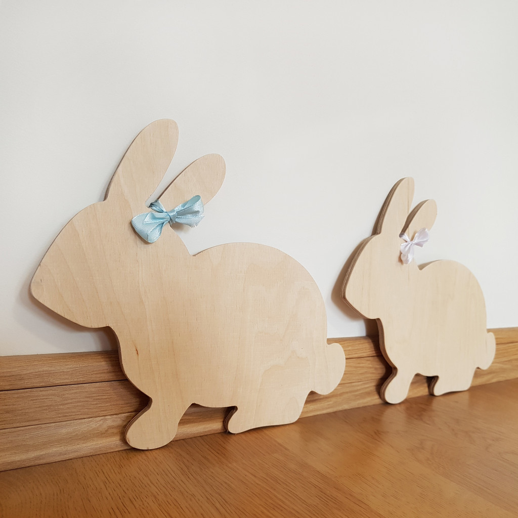 Modna dekoracja: KRÓLIK z drewna. Ozdoba drewniana wykonana ze sklejki grubości 6 mm. Nadaje się do powieszenia na ścianę lub postawienia na płaskiej powierzchni. Można przymocować do ściany za pomocą taśmy piankowej dwustronnej.