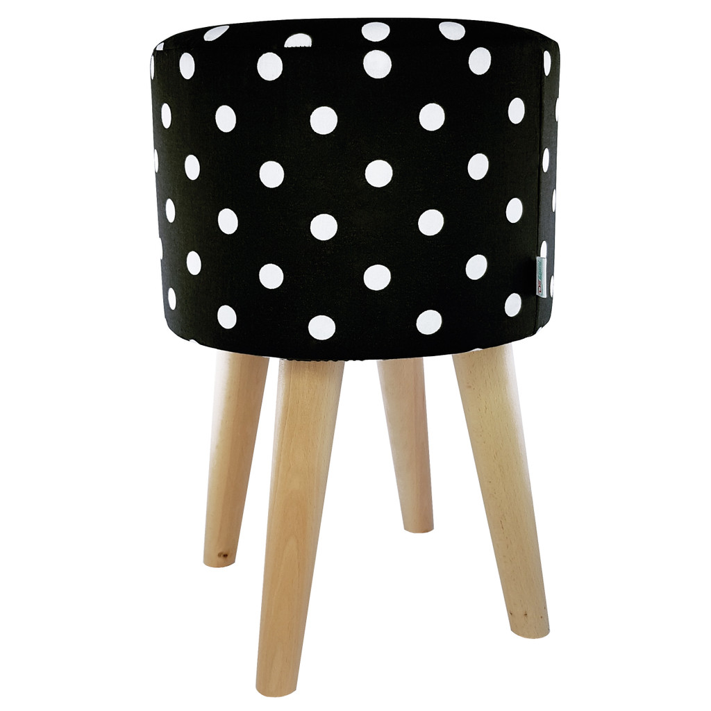 Miękki puf czarny, taboret, stołek drewniany z miękkim siedziskiem i zdejmowanym pokrowcem w białe kropki, groszki, grochy.