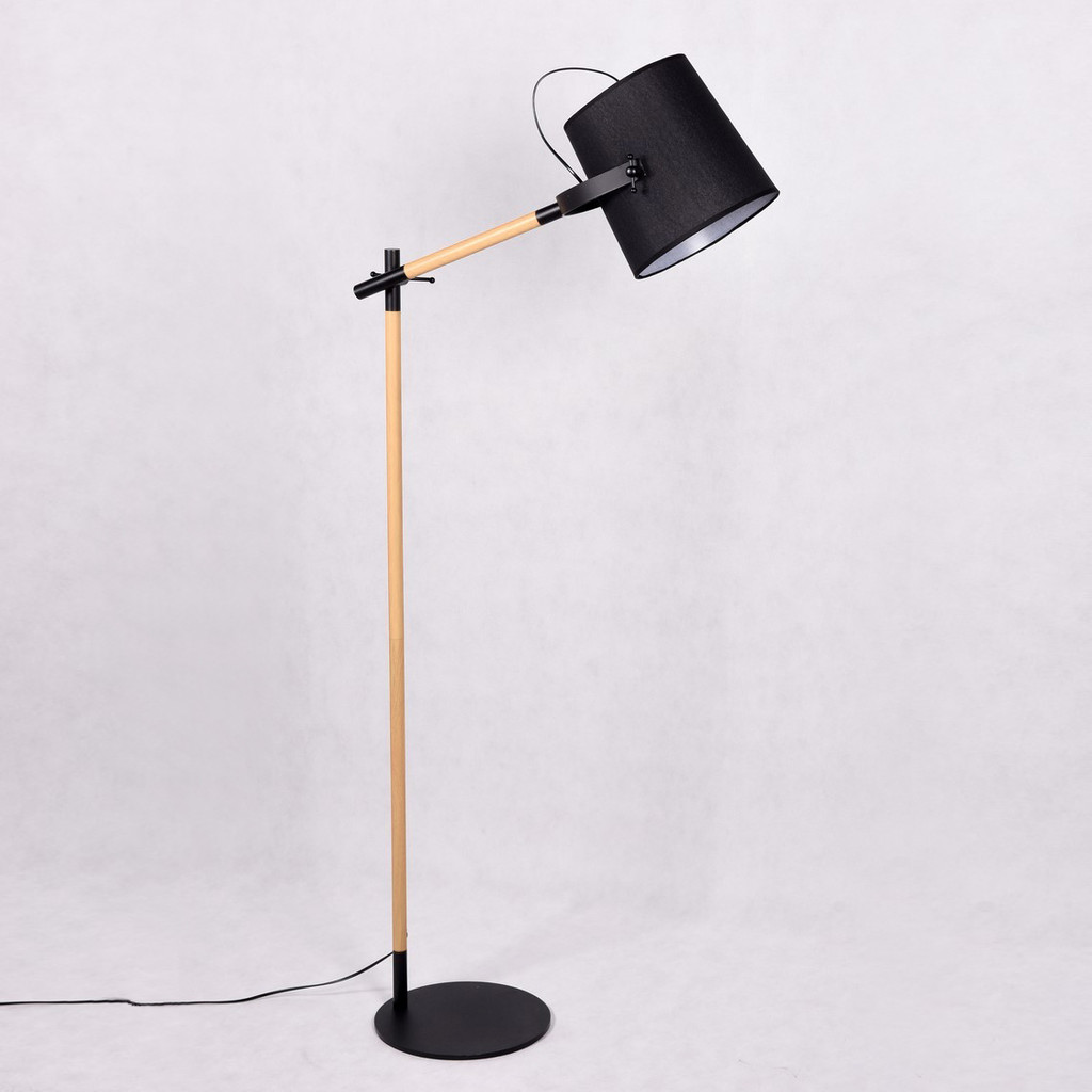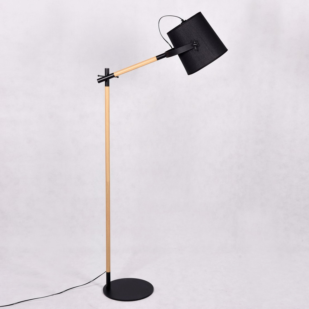 Piękna, skandynawska lampa stojąca podłogowa LAPIDUS stylizowana na drewnianą z regulowanym, czarnym, prześwitującym abażurem w modnym, nowoczesnym stylu skandynawskim. Pasuje do salonu, sypialni i innych pokojów.