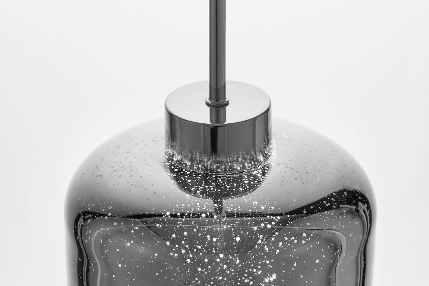 Nowoczesna lampa wisząca, zwis ALACOSMO ze szklanym kloszem w kolorze srebrnym, chromowanym. Światło w efektowny sposób przebija się przez kropeczki widoczne na powierzchni klosza. Przypomina to świecenie gwiazd.