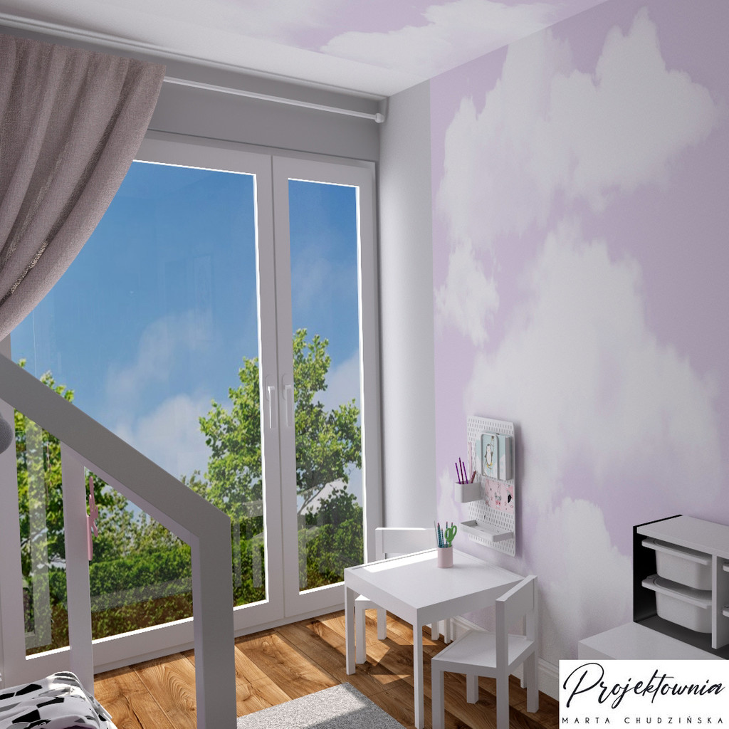 Delikatna, jasnofioletowa fototapeta w białe obłoczki, chmurki. Z pewnością idealnie sprawdzi się w pokoju dziecięcym, czy w sypialni, dzięki czemu będzie można każdego dnia budzić się z głową w chmurach.
