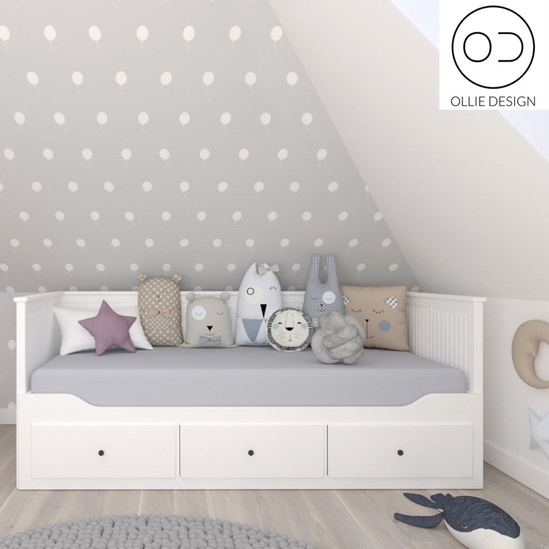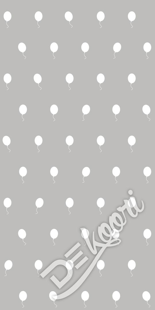 Ścienna szaro-biała tapeta w balony. Unikatowy wzór obiektowy, idealna tapeta do pokoju dziecięcego. Niektóre balony są delikatnie obrócone w prawo lub lewo urozmaicając wzór.