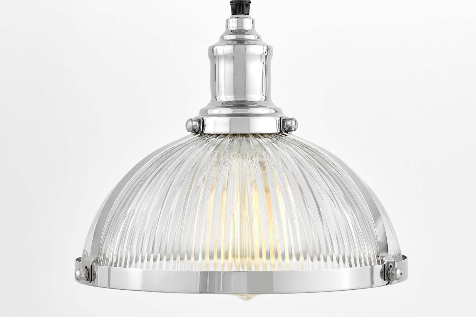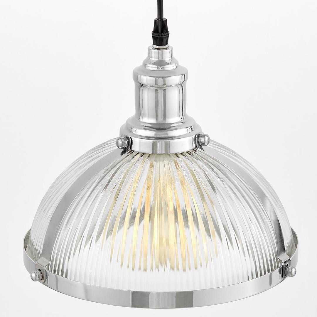 Przezroczysta lampa przemysłowa BRICO z elementami czarnymi i chromowanymi. Wykonana ze szkła i metalu. Zawieszana na regulowanym kablu. Idealna do kuchni, jadalni i lokali.