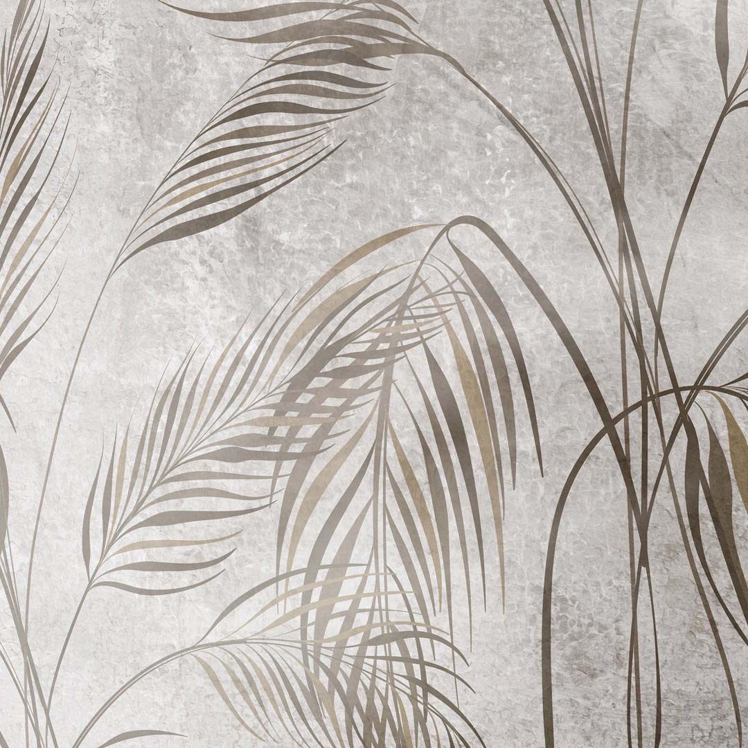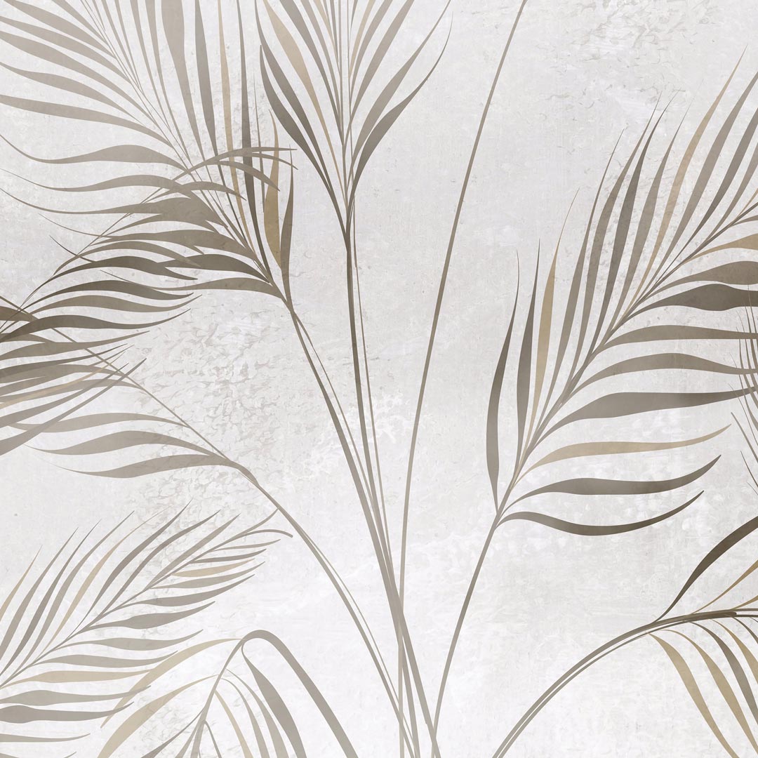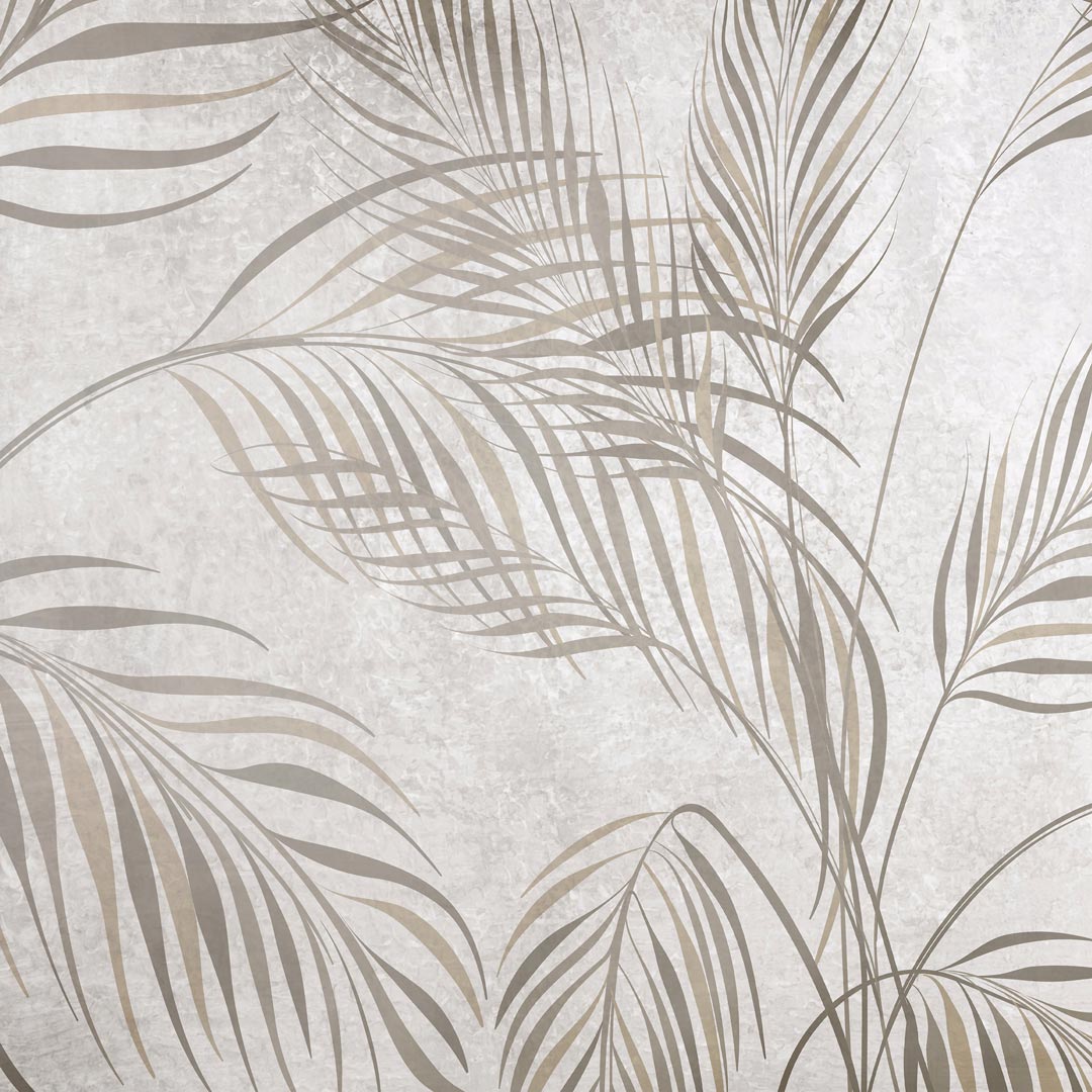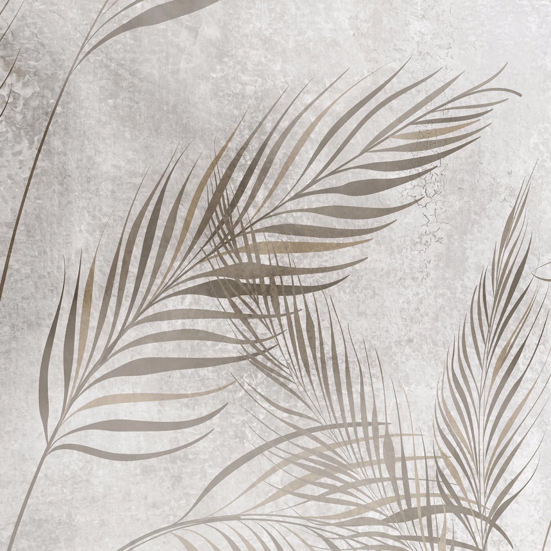 Ozdobna tapeta, beżowe i brązowe LIŚCIE PALMY NA kremowo-szarym POSTARZANYM TLE styl boho