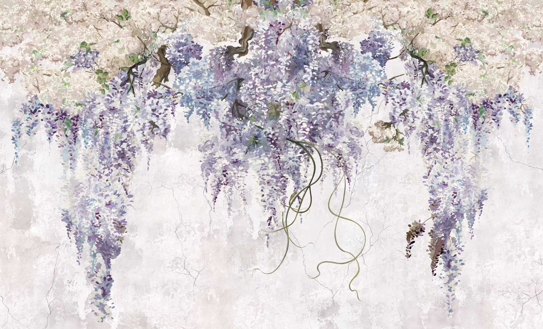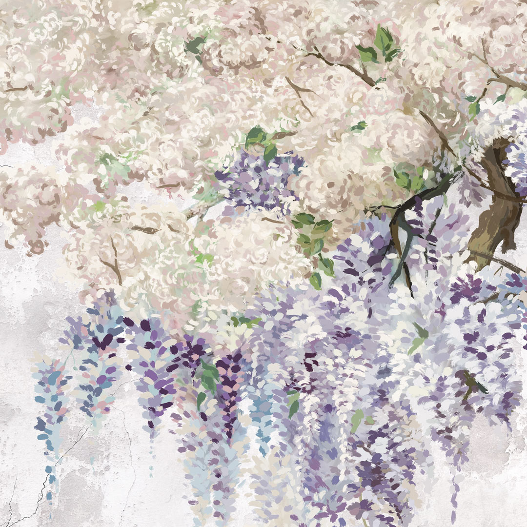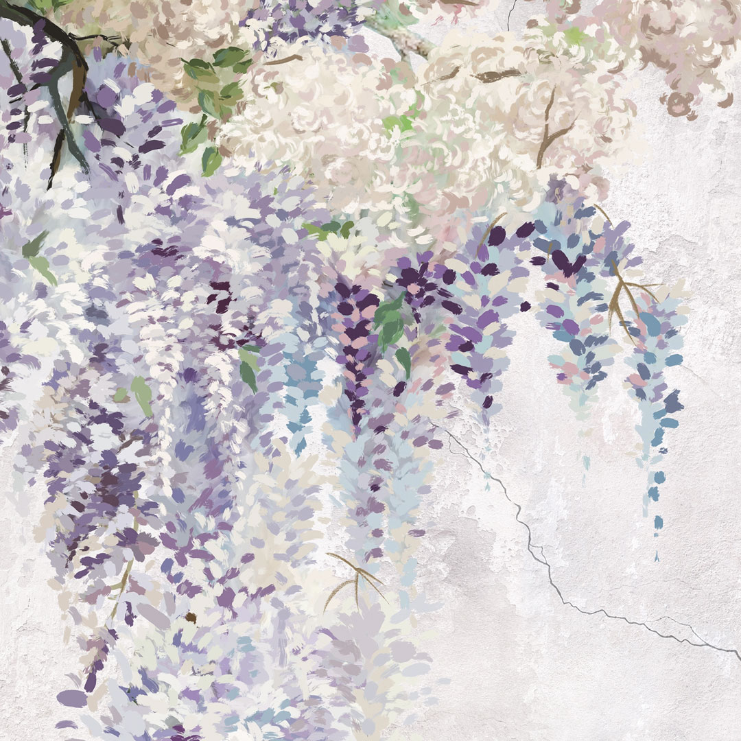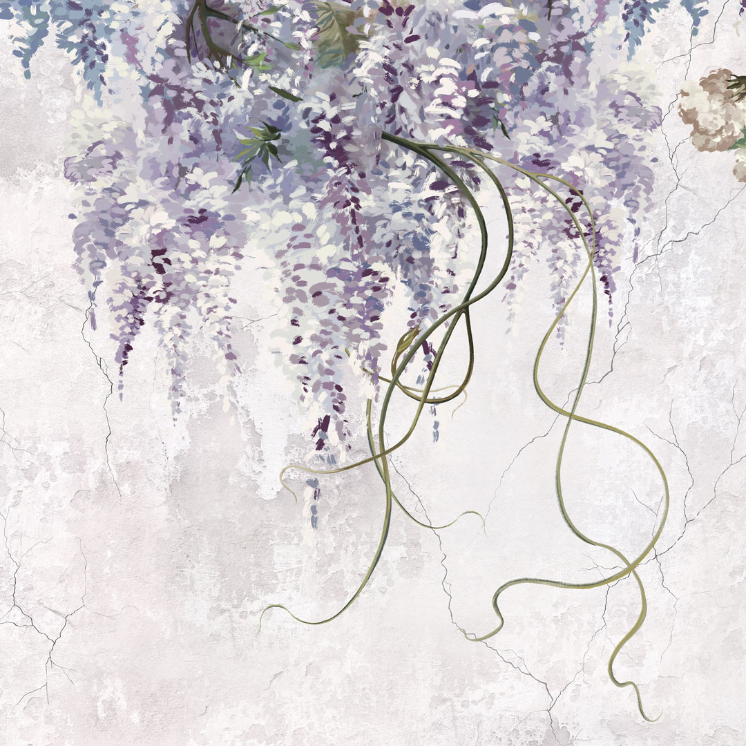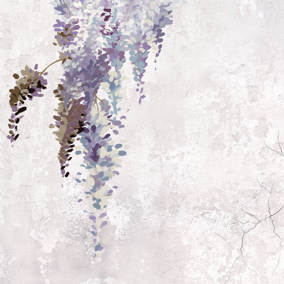 Ta wyjątkowa tapeta z motywem glicynii (wisterii) łączy w sobie delikatność natury z surowym charakterem stylu loftowego. Zwisające, malarskie kwiaty w odcieniach fioletu i lawendy subtelnie kontrastują z jasnym, postarzanym tłem przypominającym tynk lub beton, tworząc elegancką i harmonijną kompozycję ścienną.
