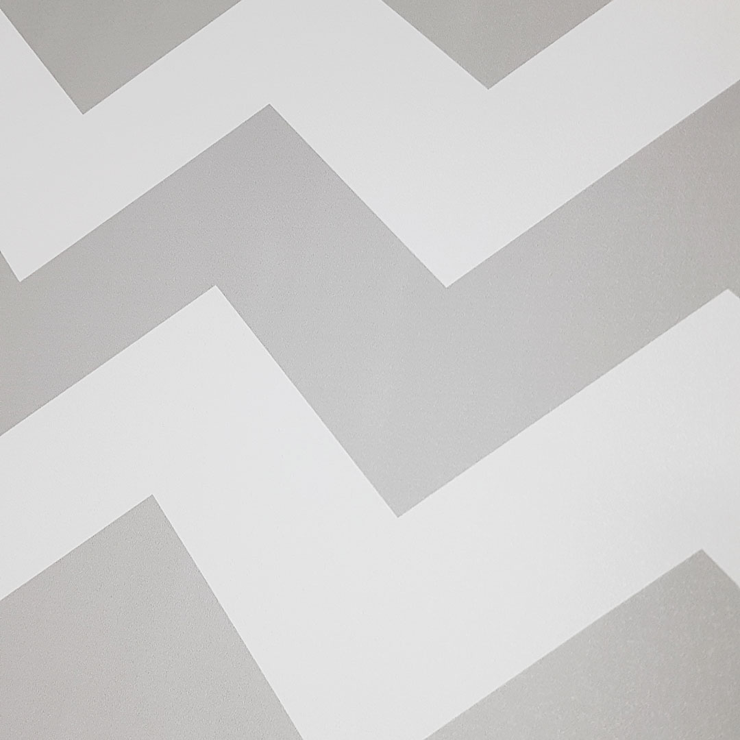Geometryczna, dekoracyjna, biało-szara tapeta ścienna w zygzaki. Bardzo modny, nowoczesny wzór i stonowana kolorystyka idealnie pasuje do stylu skandynawskiego.