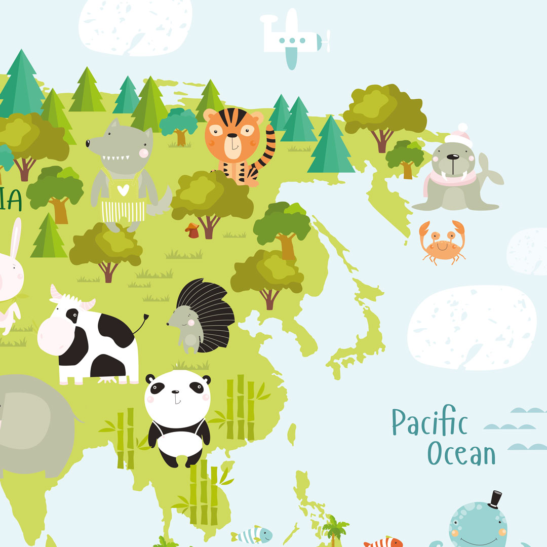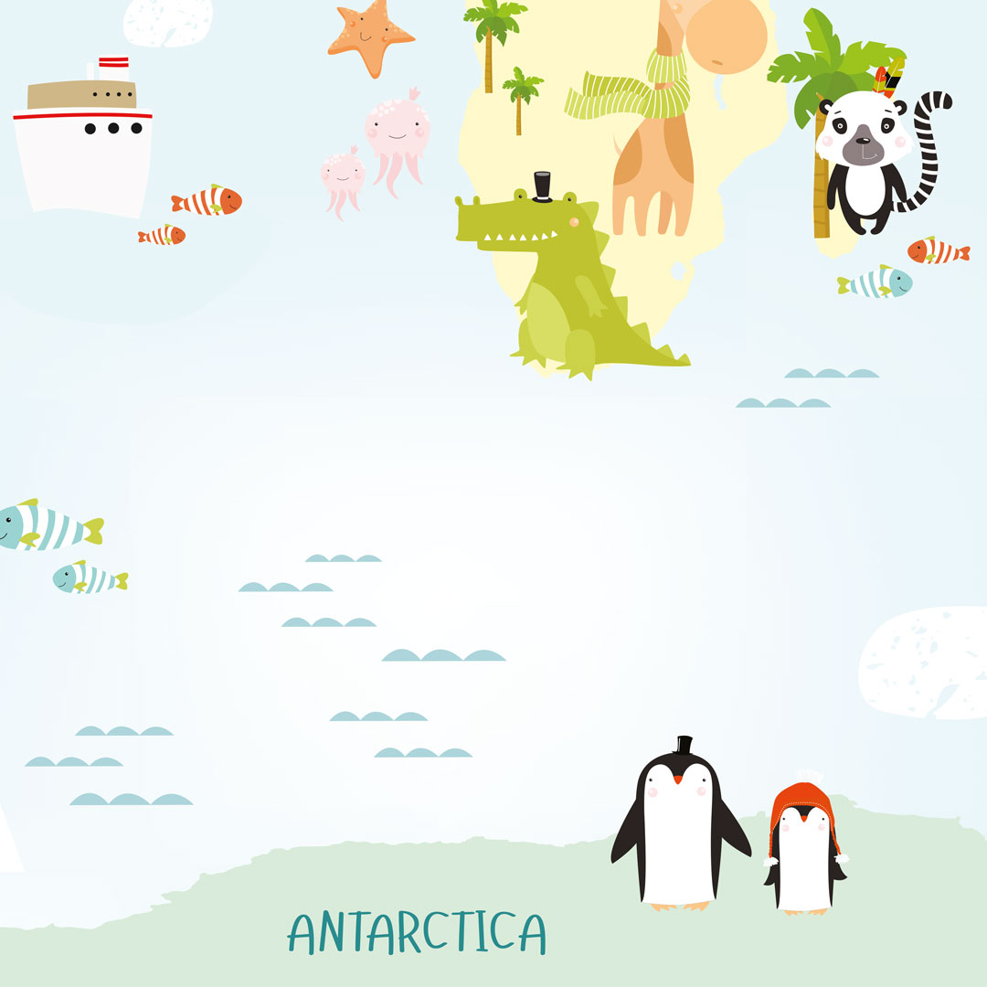 Fototapeta mapa świata dla dzieci ze zwierzętami, roślinami i kontynentami. Ta kolorowa tapeta uczy, pobudza wyobraźnię i kreatywność. Nazwy kontynentów są w języku angielskim.