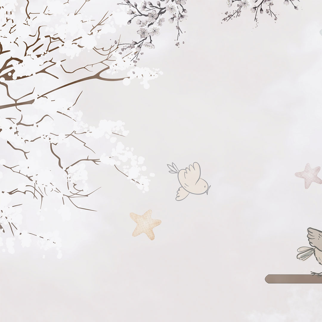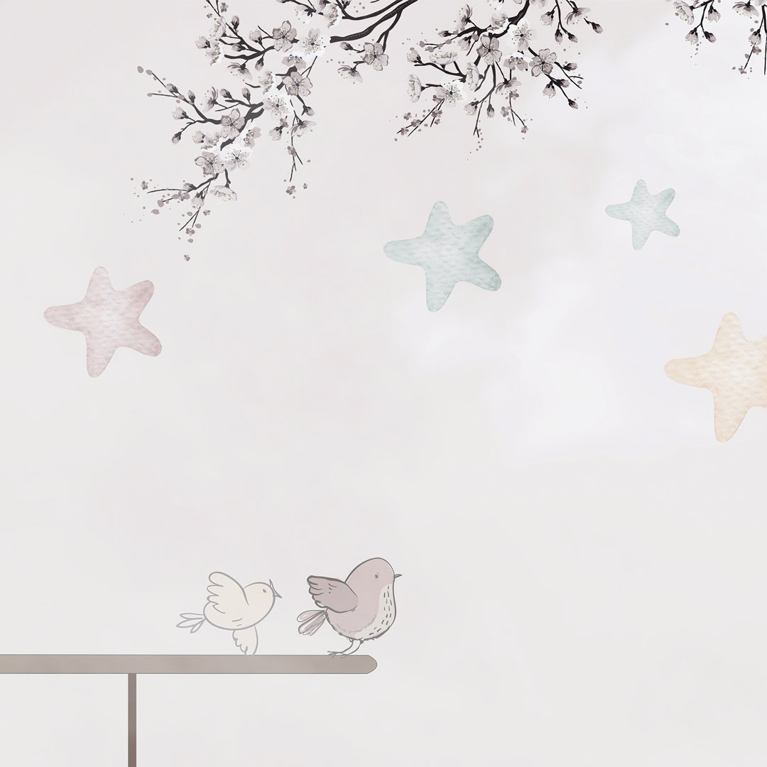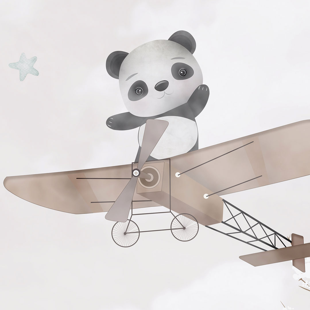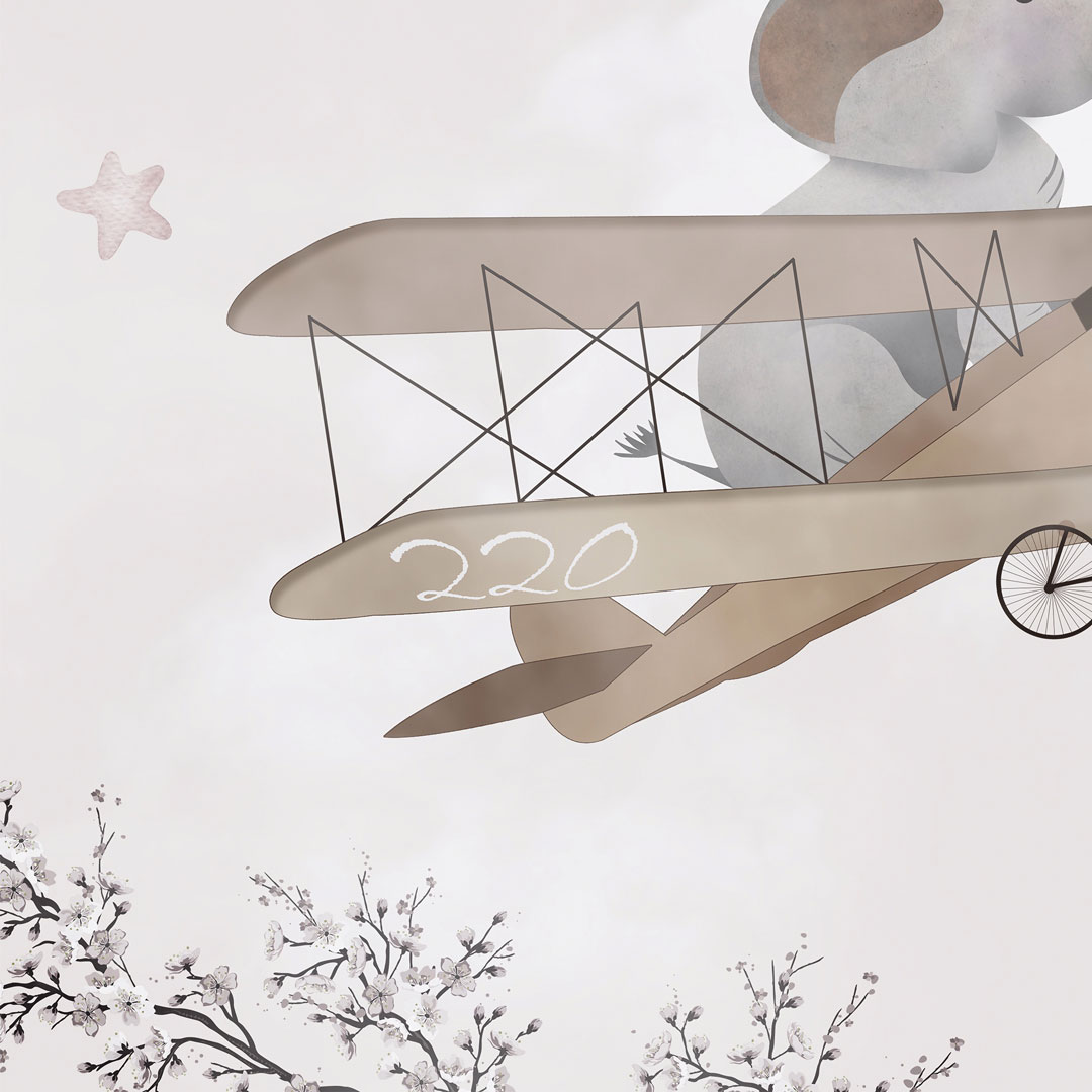 Beżowa tapeta na ścianę dla dzieci - PODRÓŻ AWIONETKĄ. Rozbawione zwierzęta (żyrafa, słonik i panda) latają po niebie, pomiędzy chmurami i gwiazdkami w retro-samolocikach ze śmigłami. Małe ptaszki, wyraźnie zaciekawione tym niecodziennym widokiem, siadają na dwupłatowych skrzydłach samolotów aby odpocząć i przyjrzeć się wszystkiemu z bliska. Projekt wykonany jest głównie w pastelowo-akwarelowych odcieniach koloru beżowego, brązowego i kremowego.
