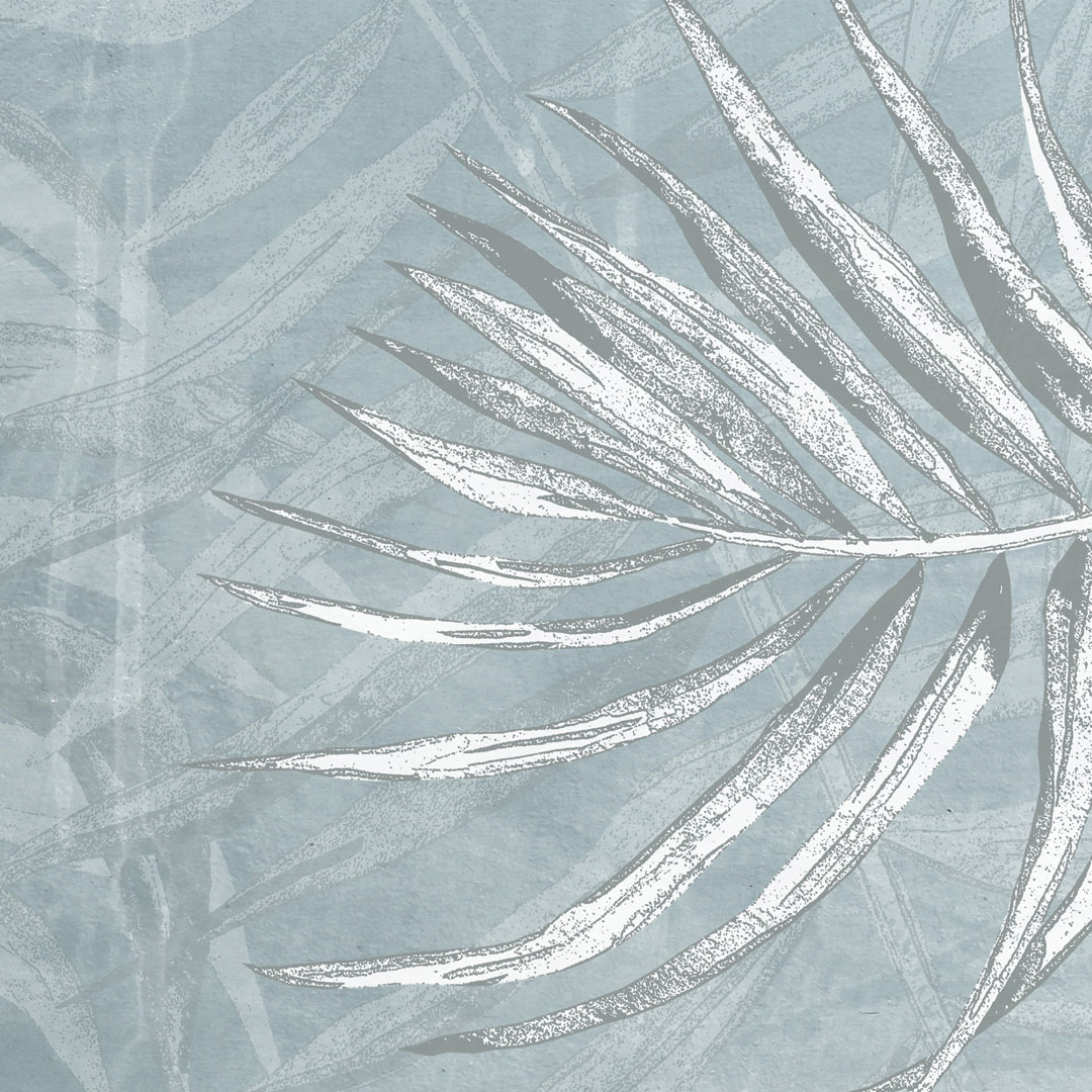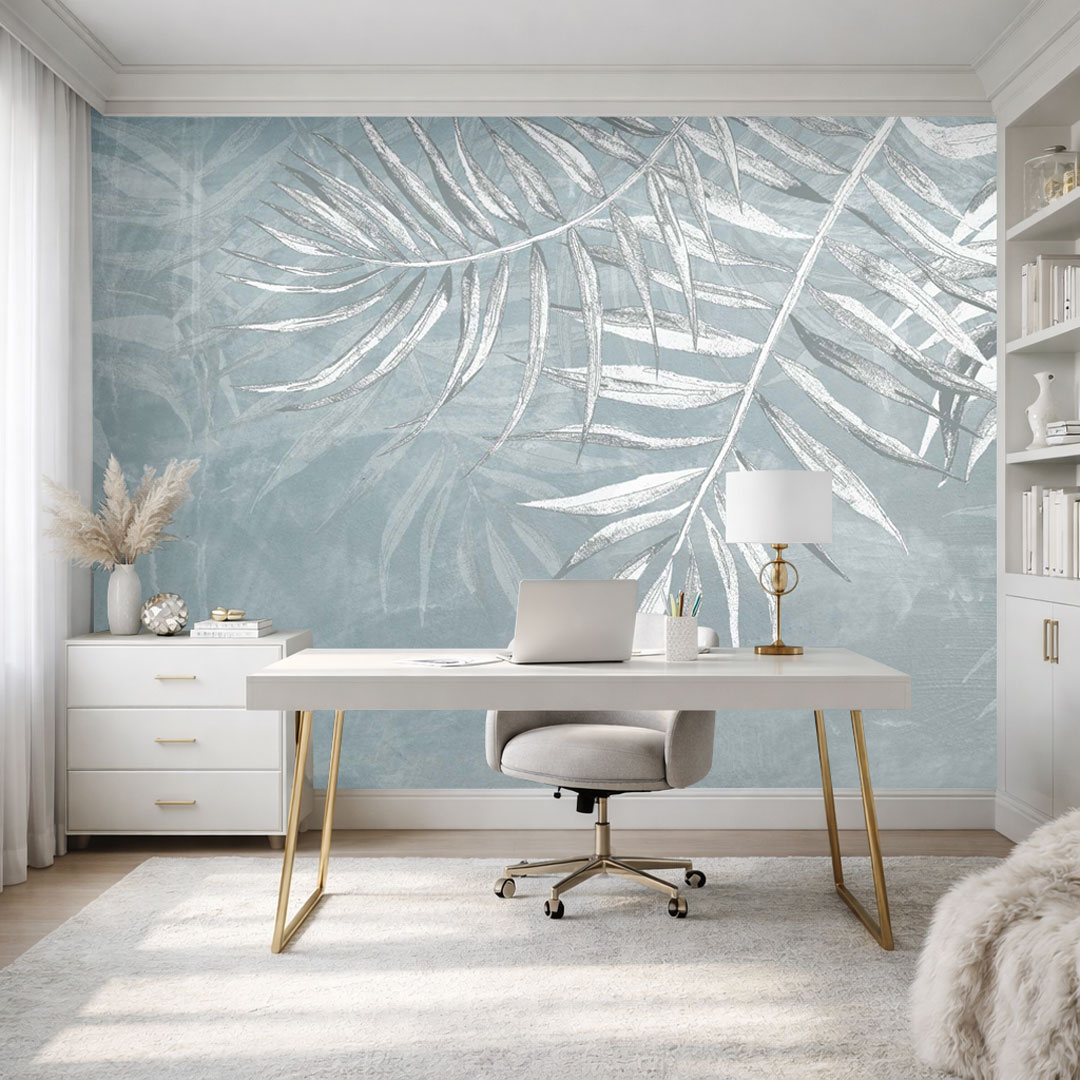 Wprowadź do wnętrza harmonię, światło i naturalną elegancję dzięki niebieskiej tapecie z dużymi białymi liśćmi palmy. Delikatny, chłodny odcień niebieskiego w połączeniu z jasnym, roślinnym motywem tworzy spokojną i przytulną przestrzeń idealną do pracy oraz wypoczynku. To doskonały wybór do nowoczesnych aranżacji inspirowanych stylem nordyckim.