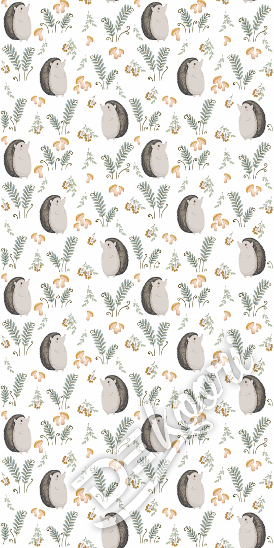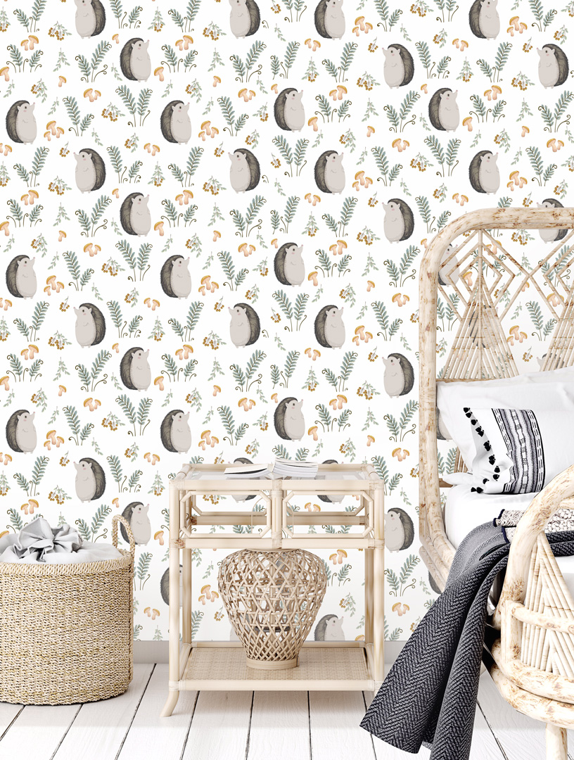 Urocza, biała tapeta na ścianę ze spacerującym Panem Jeżem pokazującym jesienne bogactwa lasu!