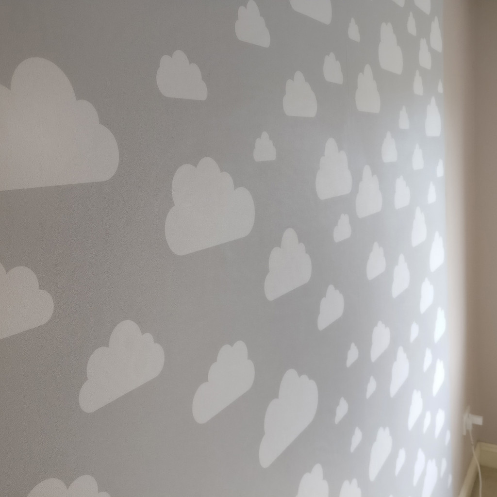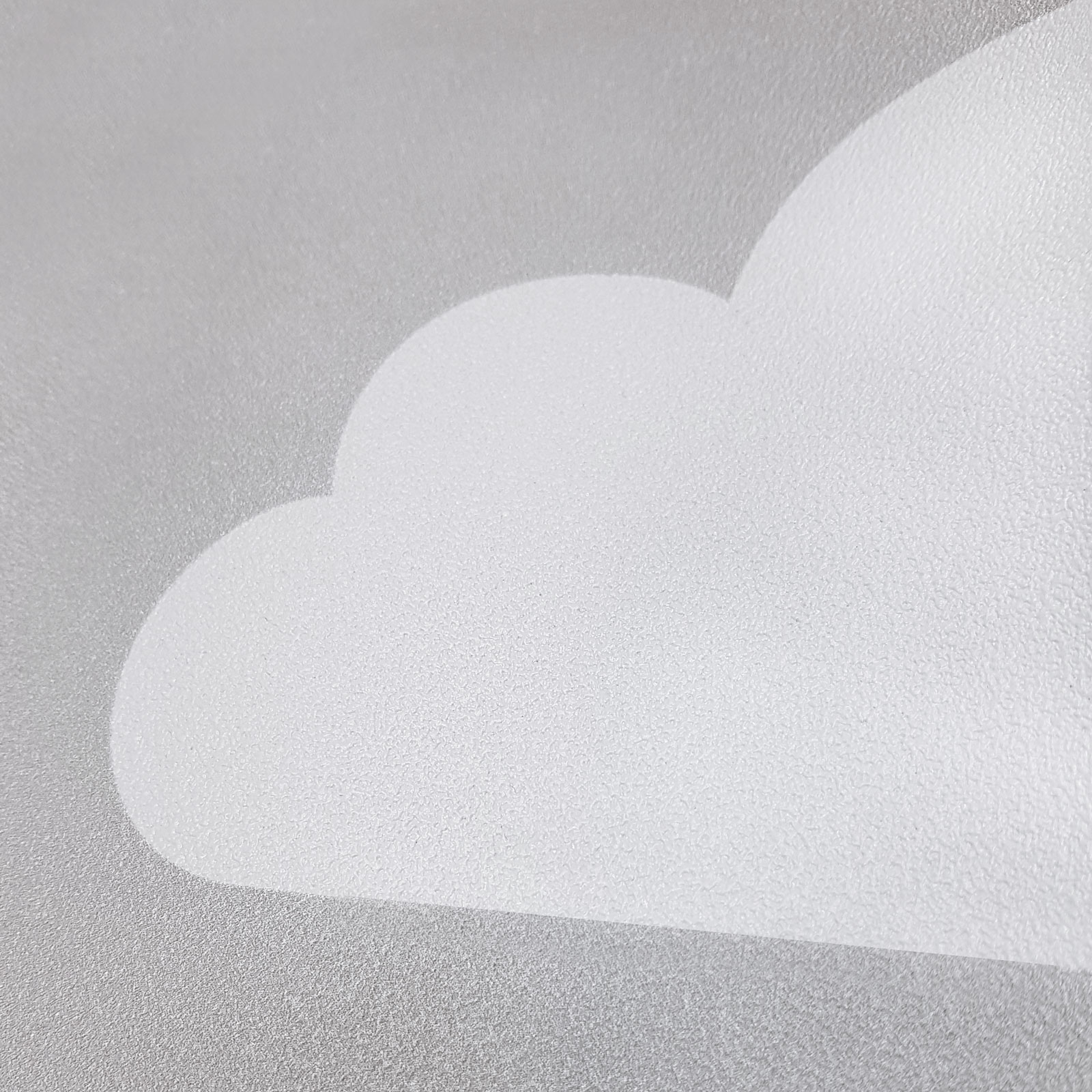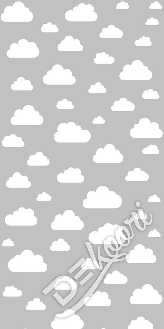 Szaro-biała tapeta na ścianę w chmury, chmurki w kilku rozmiarach. Uniwersalny wzór, który pasuje do różnych pomieszczeń. Wyjątkowo sprawdzi się jednak jako tapeta dla dzieci, do pokoju dziecięcego.