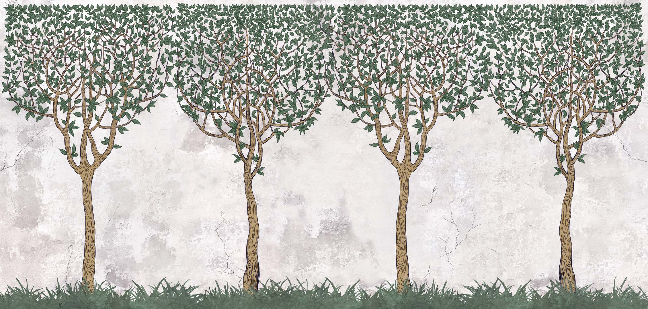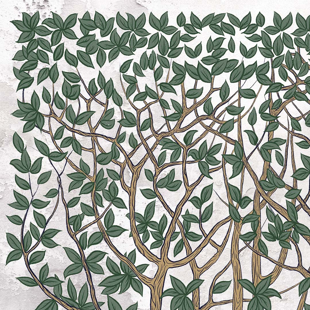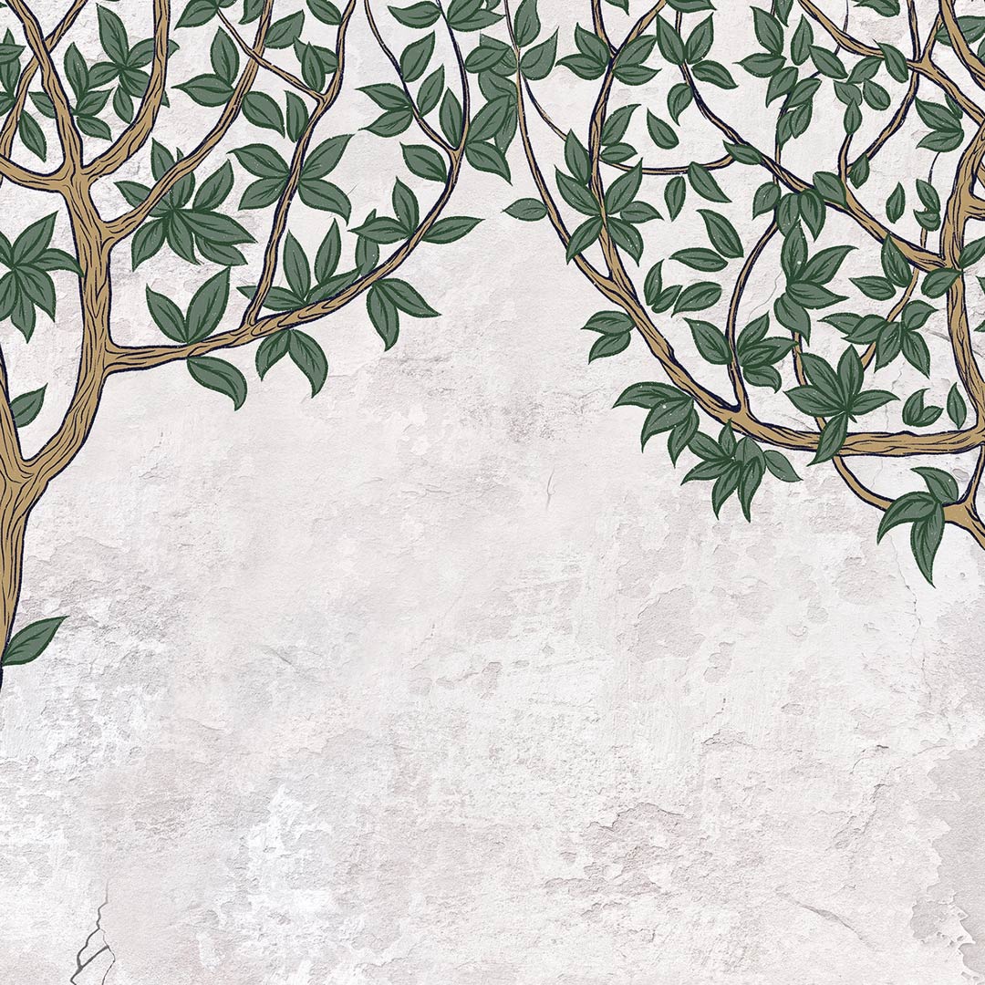 Tapeta ścienna TUSCULUM to wyjątkowa dekoracja inspirowana klasycznymi rzymskimi ogrodami, w których drzewa laurowe symbolizowały harmonię, prestiż i ponadczasowe piękno. Subtelnie ilustrowane, zielone korony drzew kontrastują z chłodnym, betonowym szarym tłem, tworząc wyrafinowane połączenie natury i architektonicznej surowości.