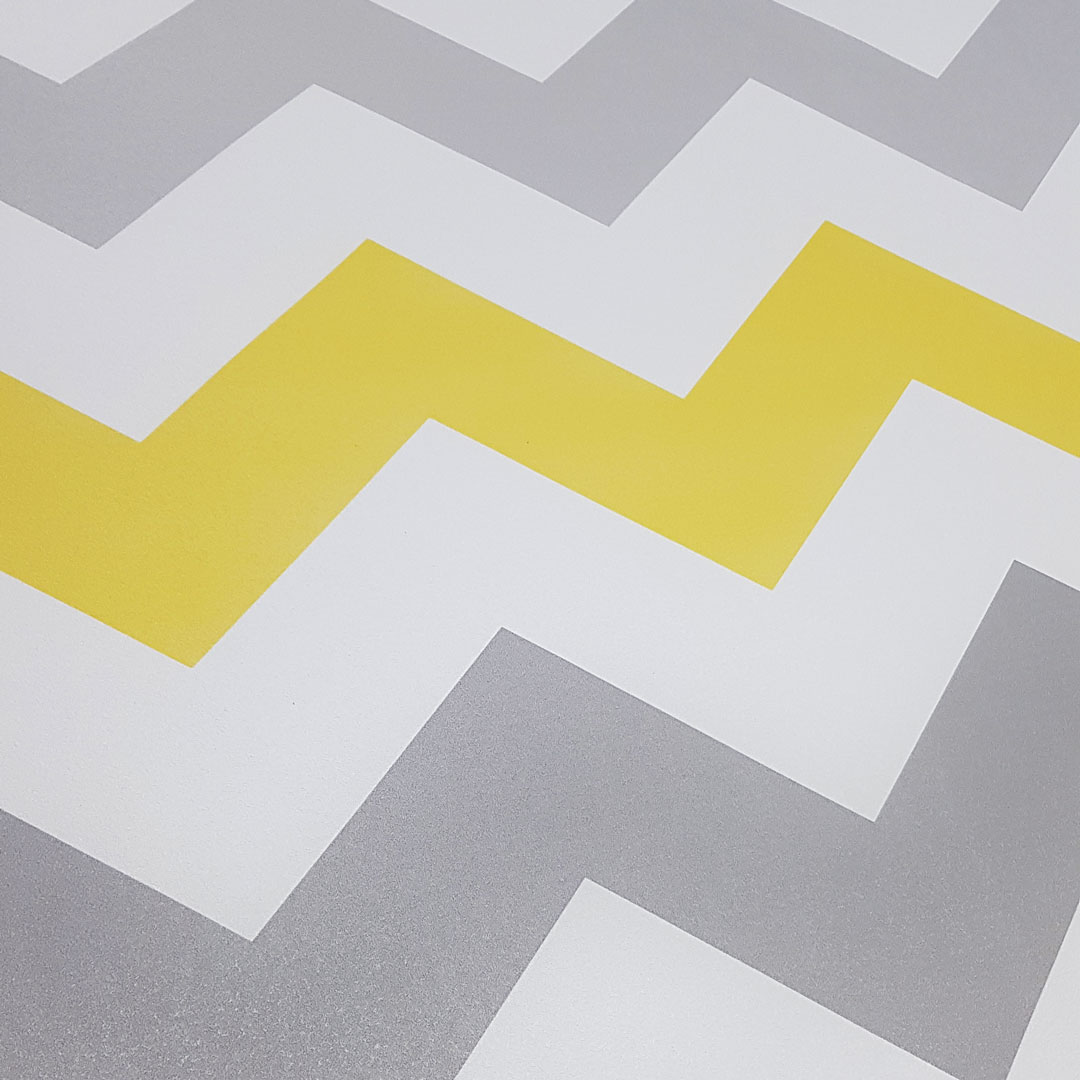 Dekoracyjna, skandynawska tapeta w zygzaki biało-szaro-żółte. Bardzo modny, geometryczny wzór i stonowana kolorystyka do nowoczesnych wnętrz.