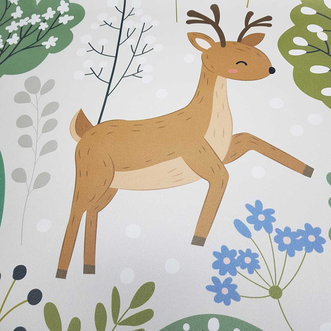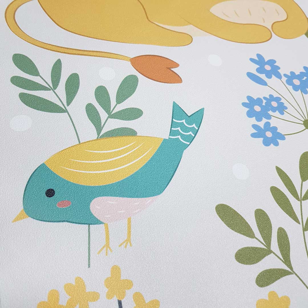 Nordycka jasna tapeta ścienna dla dzieci w jelenie, lisy, lwy i niedźwiedzie bawiące się wśród zielonych, żółtych i szarych drzew oraz ptaszki obserwujące wszystko z góry!