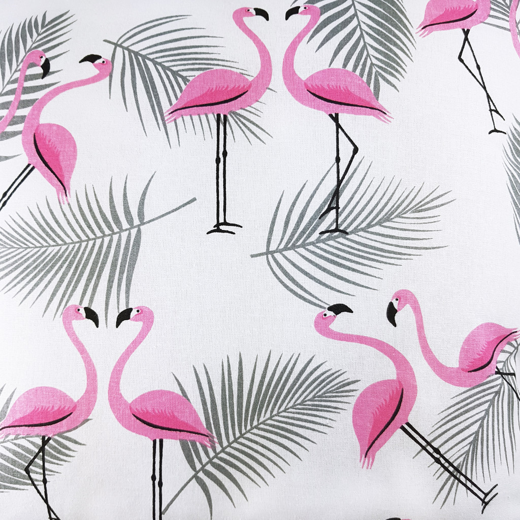 Minimalistyczna biała poszewka z różowymi flamingami obok szarych liści tropikalnych palm. Poszewka wykończona jest z każdej strony 3-centymetrowym ozdobnym obszyciem. Dekoracja wykonana jest w naszej pracowni.
