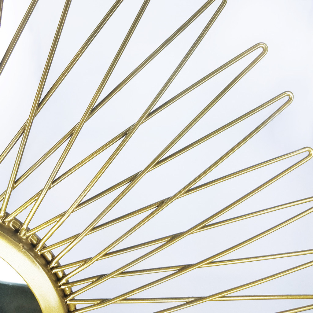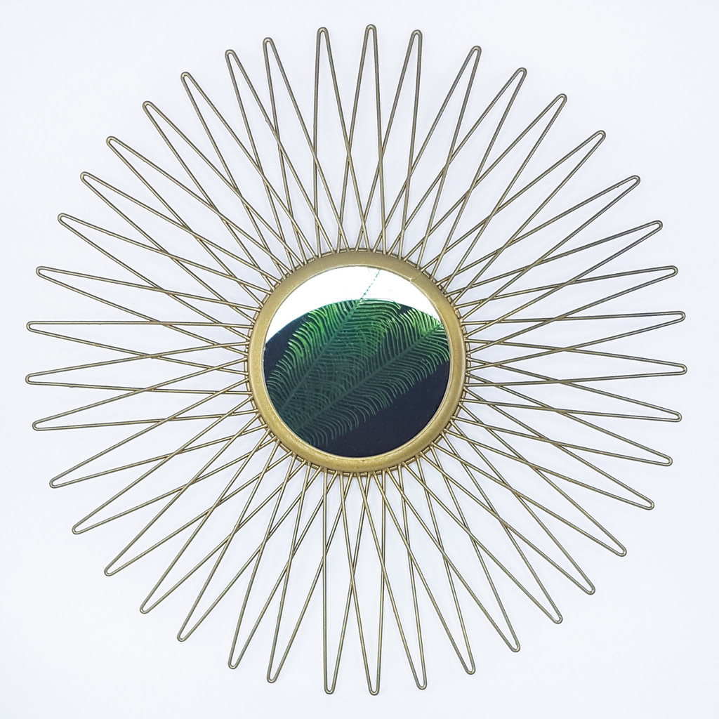 Ozdobne lusterko wiszące z metalową oprawą geometryczną przypominającą słońce. Idealne do pomieszczeń glamour w skandynawski lub nordyckim stylu. Z tyłu ozdoba posiada haczyk do wygodnego montażu.
