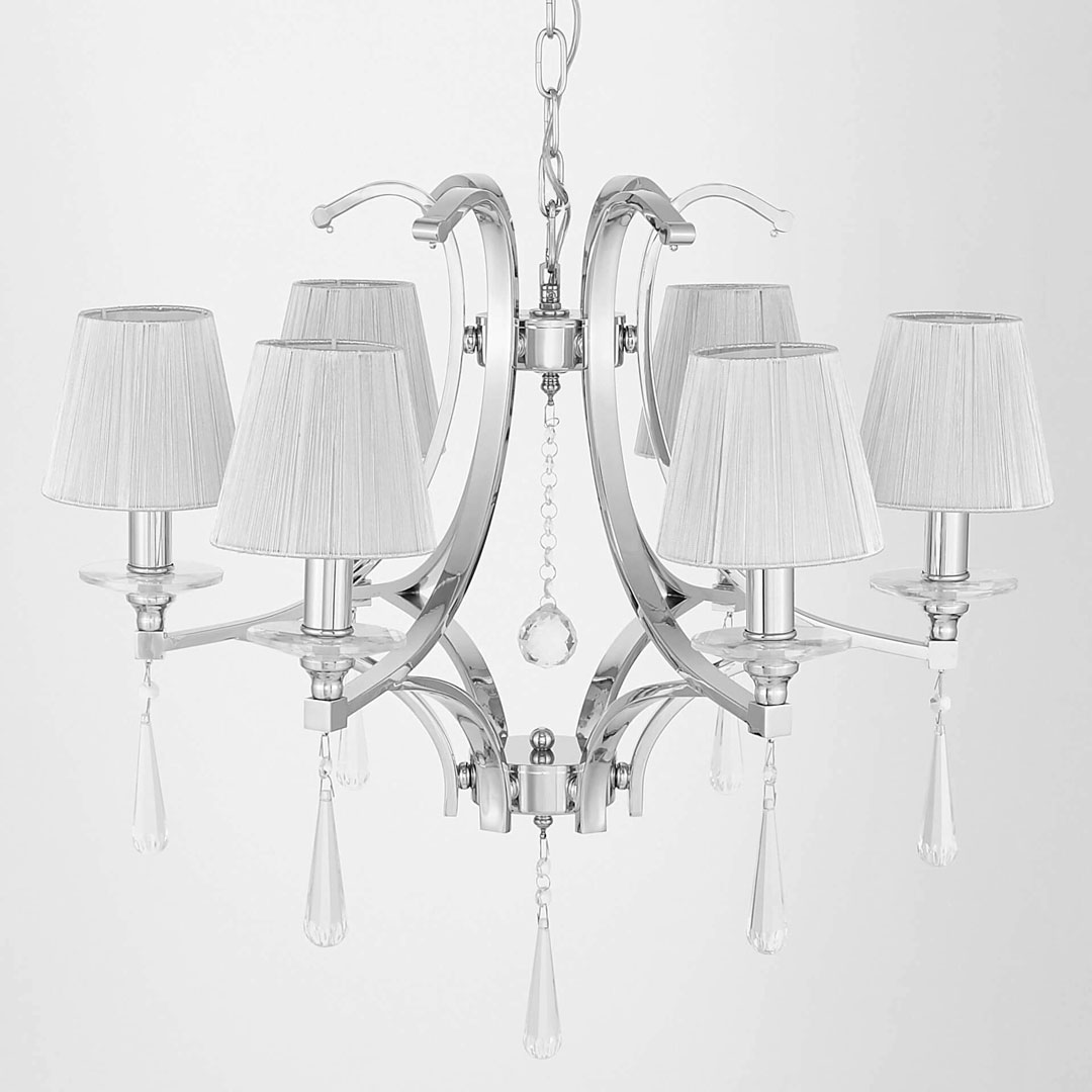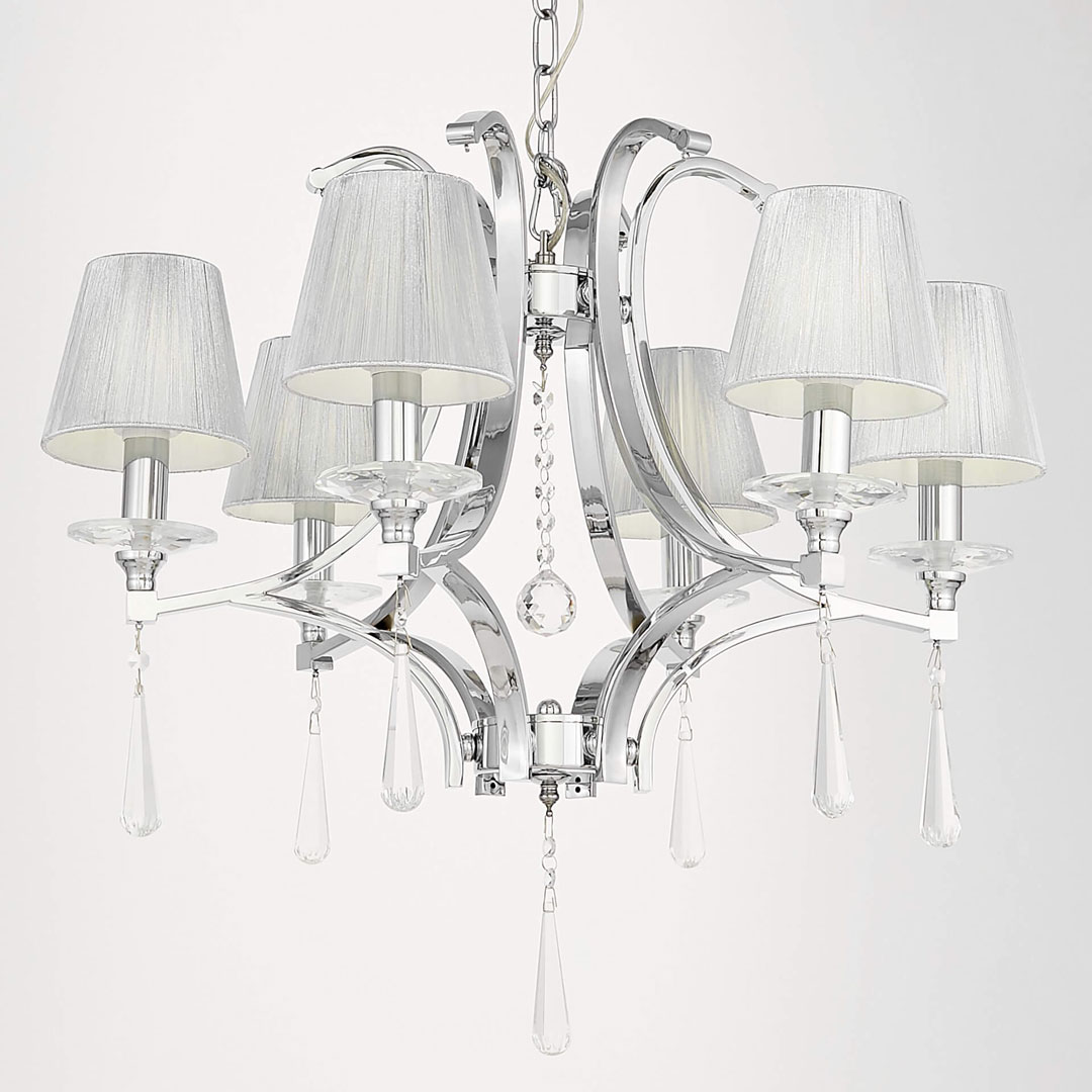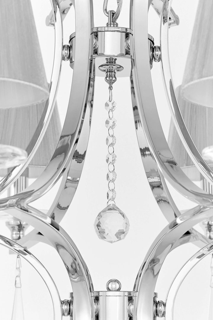 Stylowy, ekskluzywny, srebrny żyrandol kryształowy VENISIA W6 z chromowanego metalu i szkła, wiszący na łańcuchu. Udekorowany kryształkami i sześcioma jasnoszarymi abażurami.